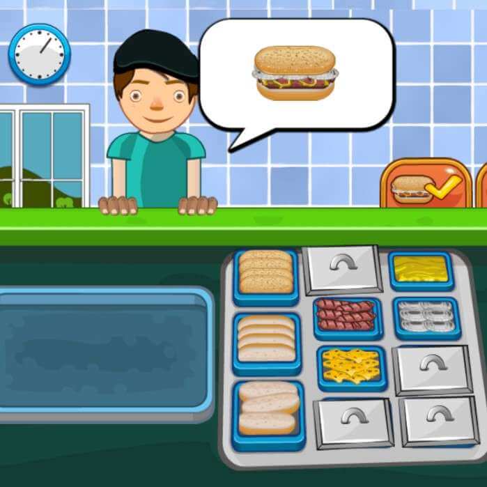 Your main job is to take the customer's order at the counter. Every customer has unique demands for toppings and preparation. You must memorize these demands quickly. There is a satisfaction meter above each customer. This meter decreases the longer they wait.